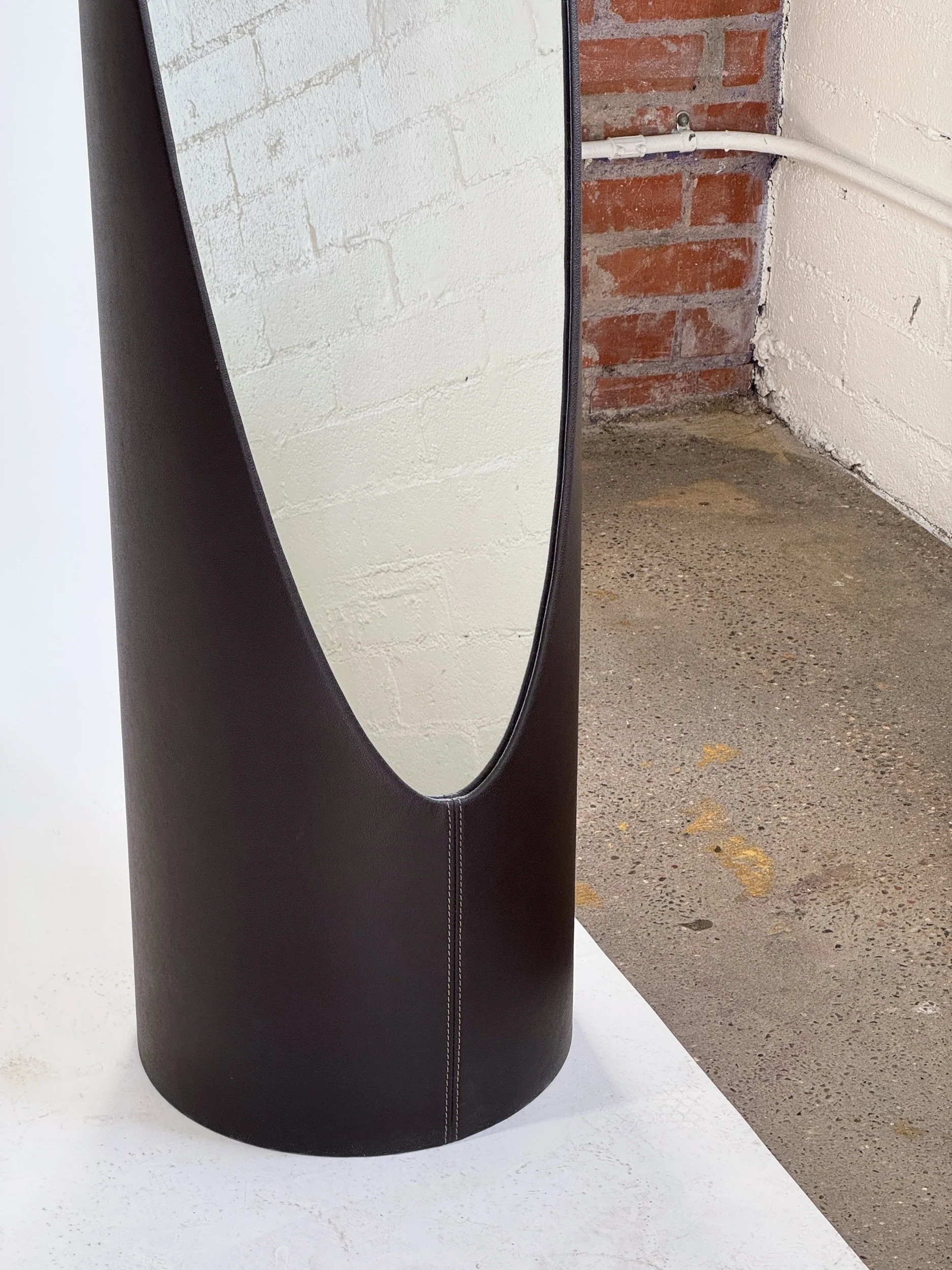 An uncommon leather wrapped lipstick mirror after Roger Lecal in deep earth toned umber. Excellent vintage condition.