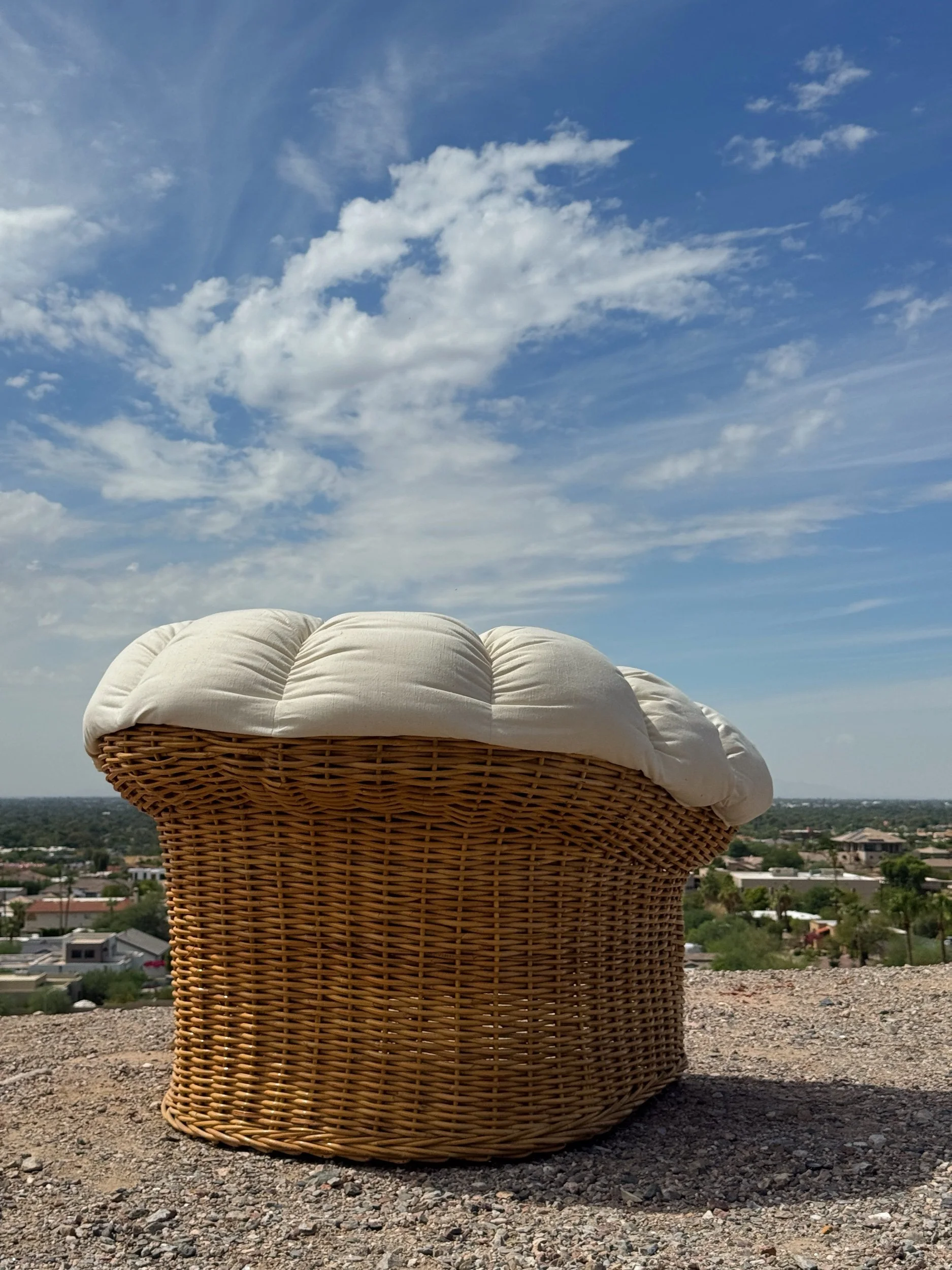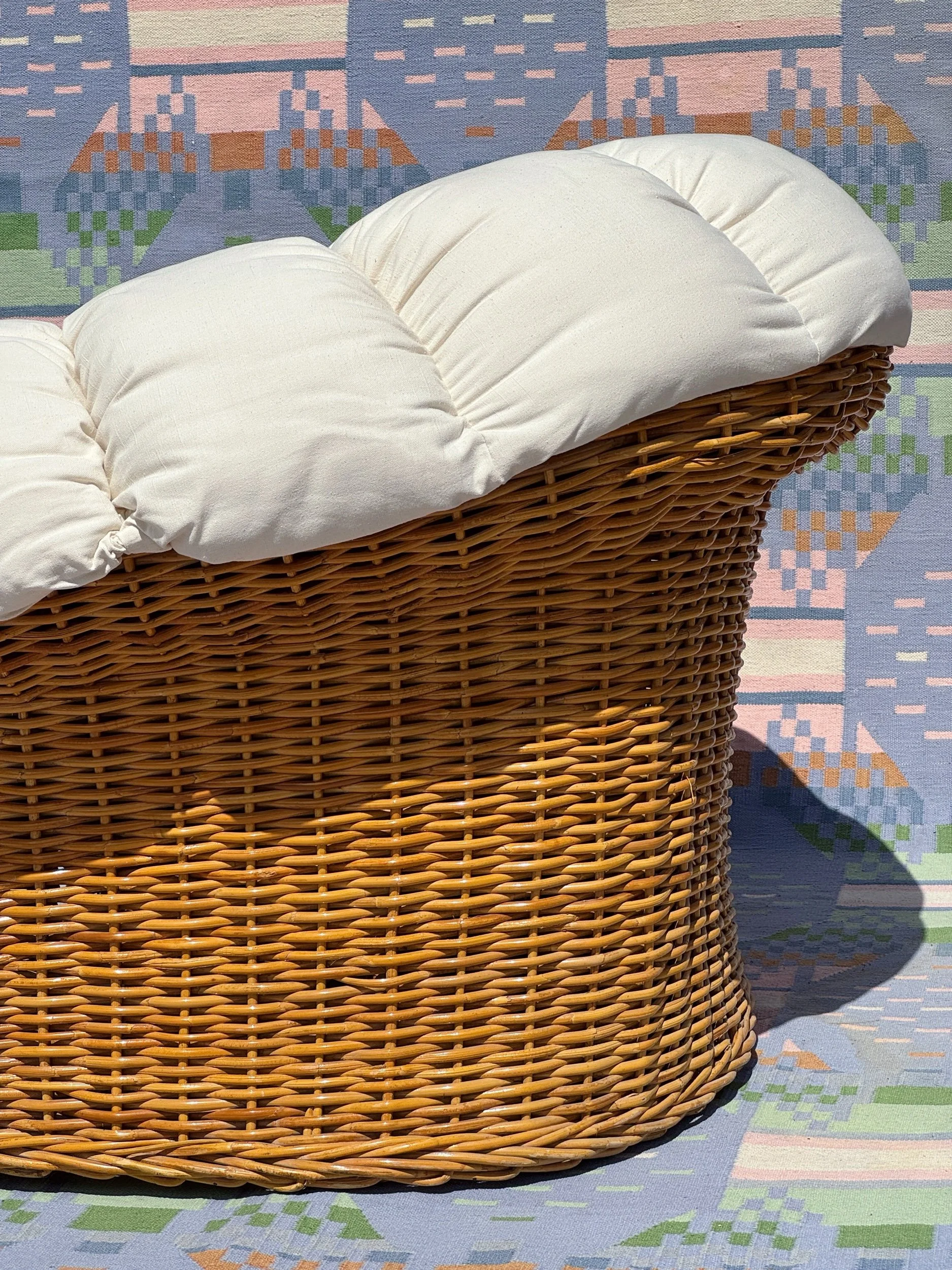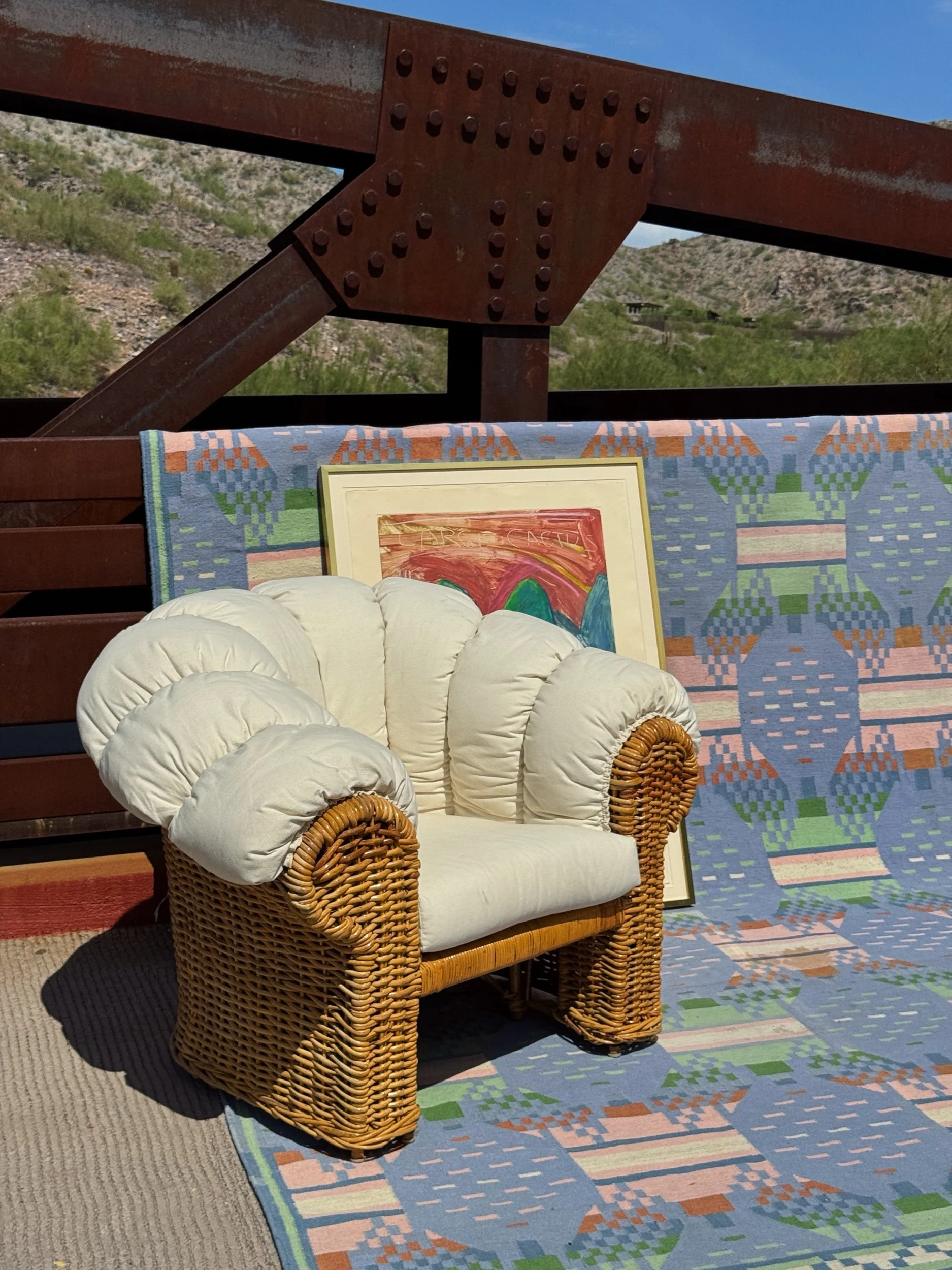 Vintage shell chair in an ivory upholstery with a warm-toned woven frame. Nice earth tone / neutral palette. Very good vintage condition. Very large and comfortable chair.